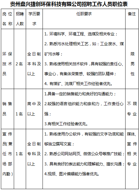 注:上述招聘公告最終解釋權(quán)歸貴州盤興捷創(chuàng)環(huán)保科技有限公司。